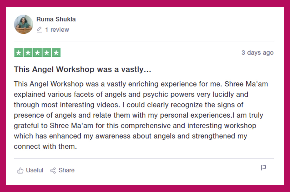 I kept seeing the number sequence of 1111 from past 2yrs, kept waking up at either 2.30 am or 3.33 am early morning...and simultaneously I was searching for youtube videos and online courses to get my answers but nothing was satisfying me or most of the course were so expensive that I could just not afford them. Then last week I saw your post and thought let me register and see if I will be able to attend it or no. The financial constrains have tightened coz of the corona effect and I am a person who will always keep family first and spend on family needs rather than myself. But I don't know what happened, was it my angel, I don't know, something told me Roshni just go for it, do this for yourself, gift yourself this program of connecting with angels. And I just went with the flow and got myself registered. Today I am very happy I made that choice to do this program.😊